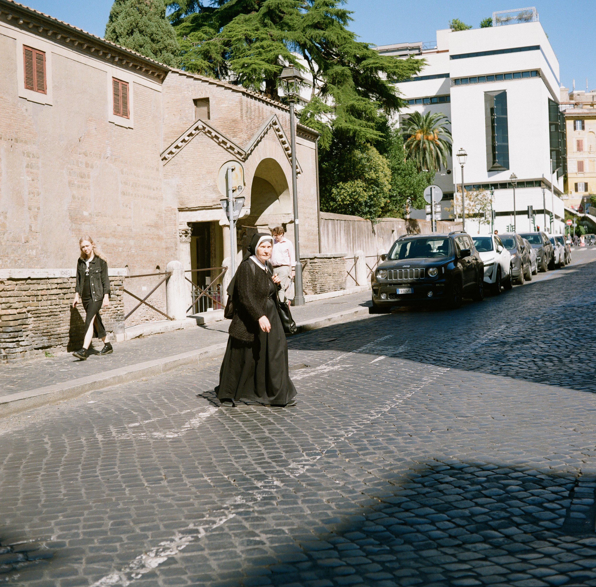A young woman walks the streets of Rome and saw me with my camera.